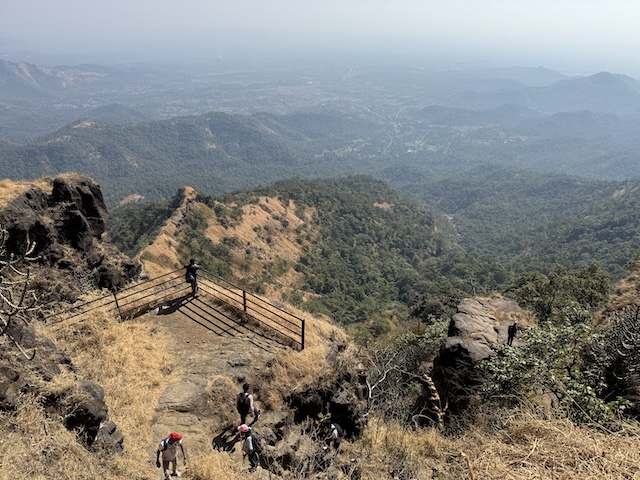 At the ridge, we were greeted by breathtaking views of the Sahyadri ranges. To our left, the path led to Ghodacha Mana, a narrow stretch resembling a horse’s neck. We took a brief detour here to enjoy the vantage point, which offered panoramic views of the valleys below.