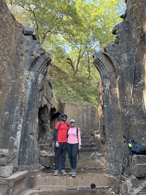 Once atop, we explored the fort’s ruins. A narrow path led us to a flat rock—a popular spot for photography. From there, a short walk brought us to a small water tank, though its contents were not potable. Continuing along the marked trail, we reached the Maha Darwaza, the grand gateway to the fort. The dome of this historic arch is now broken, but its structure still exudes a sense of grandeur.