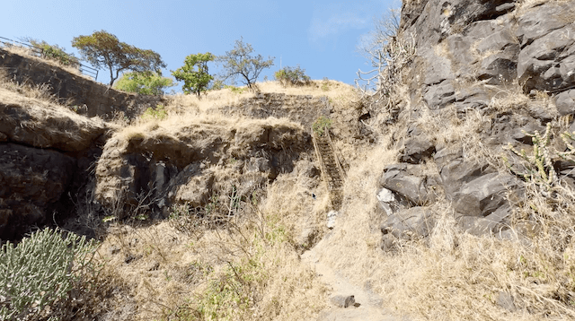 From Koti Plateau, the trail led us through a sparse forest, with the landscape turning more rugged and arid. The climb became steeper as we approached Tadmachi Plateau. The sight of the fort’s tower, adorned with a fluttering orange flag, kept us motivated. The path to the ridge required us to navigate a steep crevice. This section, though challenging, was manageable with the help of sturdy footholds and handholds.